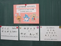 かぜ予防旬間では、かぜ予防の意識を高めるため、いくつかの企画が実施されています。9日には「宝探し」がありました。家庭科室や体育館、教室などに言葉の書かれた封筒が隠してあり、それを子ども達が見つけ、言葉を作るというものです。校内を歩き回り、たくさん見つけた子ども達。集まって言葉を考えました。うがい、手洗い、健康な生活について、大事なことをパズルのように確認しました。これからもかぜやインフルエンザには気を付けていきたいと思います。